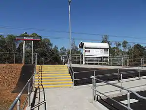 The station today consists of one platform with a steel shelter. In 2009, the platform was extended with scaffolding and plywood materials.[4] Initially intended as an interim arrangement until a permanent extension was built, the temporary platform remained until December 2019.[5] A permanent reconstruction of the platform commenced in May 2019 and was completed by December 2019.[6] Eumundi, unlike most other stations on the line, doesn't have a passing loop, although these exists a few kilometres north and south of the station.