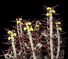 Euphorbia aeruginosa is a succulent member of the spurge family native to South Africa. It grows as a small shrub, in sandy soils and in the fractures of rocks sending up multiple spiny blue-green photosynthetic stems.[1] The plant produces yellow cyathia or flowering heads.[2]