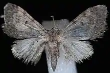 The wingspan is about 16–18 mm. The forewings are pale gray, with a small black discal spot. Adults are on wing in summer.