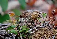 The Eurasian wryneck or northern wryneck (Jynx torquilla) is a species of wryneck in the woodpecker family.[2] They mainly breed in temperate regions of Europe and Asia. Most populations are migratory, wintering in tropical Africa and in southern Asia from Iran to the Indian subcontinent, but some are resident in northwestern Africa. It is a bird of open countryside, woodland and orchards.