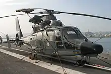 The French Navy operated the Dauphin, in addition to the dedicated military-orientated Panther variant, to conduct various missions such as the Dauphin Service Public which involves various duties from seaborne SAR, maritime monitoring, and responding to distress calls.[14][15] French Navy Dauphins are commonly deployed on board the aircraft carrier Charles de Gaulle as well as onboard other vessels of the French Navy and allies;[16][17] they are fitted with a haul-down Harpoon in order to ease shipboard landings in rough weather.[18]