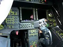 The Tiger has a tandem-seat 'glass cockpit' and is operated by a two-man crew; the pilot is placed in the forward position, with the gunner seated behind.[44][45] Either of the crew members can manage the weapon systems or the primary flight controls, switching roles if necessitated; in addition to flying the aircraft, the Tiger's pilot would typically be in control of the self-defence systems and communications, as well as some secondary weapons functions.[46] While some of the weapons use dedicated control interfaces, such as the anti-tank Trigat missile, air-to-air weapons can be managed via controls on both sets of collective and cyclic sticks.[47]