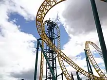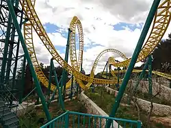 Eurofighter has a similar layout to Rage, another Gerstlauer Euro-Fighter roller coaster at Adventure Island in Southend-On-Sea, Essex, UK, and has the steeper-than-vertical 97-degree drop characteristic of all Gerstlauer Euro-Fighters.[8] The coaster is reported in some sources as having 2 inversions[5][8] and in other sources as having 3 inversions.[9][10] All sources describe the coaster as having a vertical loop and a roll (alternatively described as the often misidentified heartline roll[10] or an inline twist[5]), but some sources report that an overbanked curve in the coaster qualifies as an "inline loop".[10]