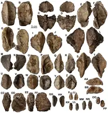 A spine from the cervical or pectoral region is represented only by the anterior half. The spine has an asymmetric, Y-shaped cross-section and has a base that flares more than a Type 2 caudal plate, suggesting that the spine was positioned on a broad flank of the body. Osteoderms with sharp anterior and posterior edges, and are hollow, asymmetric-based plate-like ran down the sides of the tail but decreased in size more rapidly. These osteoderms were similar to those of Mymoorapelta, Gargoyleosaurus, Gastonia and Polacanthus. Subrectangular to subtrapezoidal, solid osteoderms preserved in the holotype and paratype specimen are similar to the medial cervical osteoderms of half-rings and the mid-line of the pectoral region. These osteoderms have a low, evenly developed keel running down the long axis. Asymmetric, diamond to tear-drop shaped osteoderms are also found in both specimens and would have been in oblique rows anterior to the sacrum based on close relatives. The trunk of the body and the sides of the tail were covered in moderately asymmetric osteoderms. Medium to large oval to circular osteoderms were probably present on the posterior portion of the sacrum or within more expansive spaces among the larger dorsal armour. These osteoderms could have also lie on the tail between the caudal plate-like osteoderms or the side of the limbs. Flat, oval to subtriangular osteoderms that measure 12 cm long and 7 cm wide were present on the forelimbs based on the position of similar osteoderms in Sauropelta. Small ossicles that ranged in shape probably filled in the spaces between larger osteoderms. These ossicles appear to be present in many ankylosaur taxa such as Sauropelta, Gastonia and Tarchia. The posterior margin of the ilium preserves large, subequal-sized osteoderms that are tightly sutured together but was not coossified as in Aletopelta. An osteoderm with a large, posteriorly curved, plate-like keel may have been closely appressed to the more anterior portion of the ilium based on the gently convex and smooth base.[1]