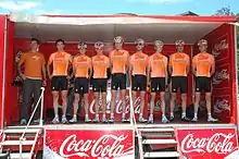 Euskaltel–Euskadi (UCI team code: EUS) was a professional road bicycle racing team from Spain, Europe. The team was commercially sponsored, but was also partly funded by the Basque Government until the end of 2013, with riders either from the Basque Country, Navarre, La Rioja, and the French Basque Country, or who had grown up in the cycling culture of those regions:[1][2] This policy was abandoned to enable retention of World Tour status. Its sponsor was Euskaltel, a Basque telecom company. Euskaltel–Euskadi was famous for its all-orange team kits. Whenever the Tour de France passed through the Basque Country many spectators lined the route dressed in the team's orange or the colours of the Basque flag. The Euskaltel team also has a second team inside the "Fundacion Euskadi", this team rode in a continental category, the name of the team was Orbea. This team was created with the aim of forming the young cyclist before going to the Euskaltel–Euskadi.