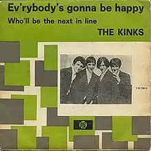 "Ev'rybody's Gonna Be Happy" is a song by Ray Davies, released as a UK single by the Kinks in 1965. As the follow-up to the number-one hit "Tired of Waiting for You", and having their previous three singles all chart among the top two, it was less successful, reaching number 17.[2] It broke a run of what would have been thirteen consecutive top-ten singles in the UK.