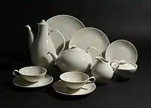When Eva Zeisel arrived in the US, she had to reestablish her reputation as a designer. Beginning in 1937, she taught at Pratt Institute in New York.[5] She and her students created designs for the Bay Ridge Specialty Company including Stratoware (a rare, short-lived line made for Sears), designed by student Frances Blod, under Eva's supervision.[11]