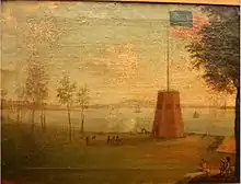Following the significant losses at the Battle of Long Island on August 27, 1776, General George Washington and the Continental Army retreated across the East River by benefit of both a retreat and holding action by well-trained Maryland Line troops at Gowanus Creek and Canal and a night fog which obscured the barges and boats evacuating troops to Manhattan Island.[2] On September 15, 1776, the British flag replaced the American atop Fort George, where it was to remain until Evacuation Day.