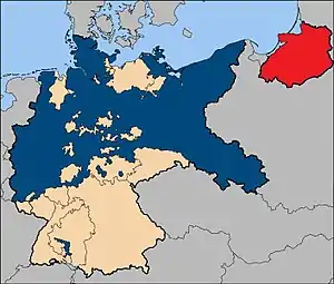 ![]() East Prussia (red) was separated from Germany and Prussia proper (blue) by the Polish corridor in the inter-war era. The area, divided between the Soviet Union and Poland in 1945, is 340 km east of the present-day Polish–German border. | |||||||