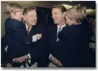 After a debate over whether he met the state's five-year residency requirement to be on the ballot,[16] Bayh defeated former Kokomo Mayor Steve Daily in the Democratic primary of the 1988 Indiana gubernatorial election. He went on to defeat the incumbent lieutenant governor (Republican John Mutz) in the general election, becoming the first Democrat to serve as Governor of Indiana in 20 years. Only 32 years old upon his election and 33 when he took office, Bayh became the youngest governor in the nation at the time.[17] He was re-elected as governor in 1992, defeating State Attorney General Linley E. Pearson with 63% of the vote.[18]