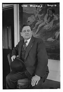 Evan Williams was born on 7 September 1867 in Mineral Ridge, Ohio, the son of David Williams and Gwendolyn Harris.[1] His parents were recent poor Welsh immigrants from Pembrokeshire, Wales. They were married in 1867 in Trumbull County, Ohio. When Evan was 13 years old, his Mother died in childbirth, and he was sent to live with his aunt and uncle, Thomas and Sarah Davis in Thomastown, a Welsh immigrant mining community near Akron, Ohio.