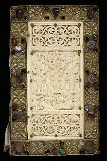 The story of the manuscript begins with the ivory plaques measuring over 500 cm2 that were incorporated into the book cover. In the Casus Sancti Galli, Ekkehard comments on these plates as follows: "These were, however, former wax tablets to write on, like the ones that Charlemagne, according to his biographer, usually placed beside his bed when he went to sleep".[3] These plates, which were formerly used by Charlemagne as writing pads, were probably bequeathed by the Emperor to the archbishopric of Mainz and thence came into the possession of Hatto, at that time Archbishop of Mainz (891–913). When Hatto had to accompany King Arnulf (850-899) to Italy, he asked his friend, Abbot Salomo of Saint Gall (890-920), to keep his treasure save during his absence. However, instead of guarding it as promised, Salomo III soon spread a rumour about Hatto’s death and took possession of his treasure. Whereas he donated most of it to the poor and gifted another part to the Minster of Constance, he also incorporated part of the treasure, for instance the two ivory plates, into the Saint Gall monastery treasure.[4] Then he commissioned his most talented artist, the monk Tuotilo († 913) with the adornment of the plates and the monk Sintram, who was known to be a talented penman, to write an evangeliary.