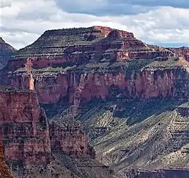 Evans Butte is a 6,379-foot-elevation (1,944-meter) summit located in the Grand Canyon, in Coconino County of northern Arizona, US.[2] It is situated at the north end of Sagittarius Ridge, three miles south-southwest of King Arthur Castle, and two miles southeast of Dox Castle. Topographic relief is significant as it rises over 4,100 feet (1,200 meters) above the Colorado River in 2.5 miles (4.0 km), and the north aspect rises 2,700 feet above Flint Creek in one mile. According to the Köppen climate classification system, Evans Butte is located in a cold semi-arid climate zone, with precipitation runoff draining west to the Colorado River via Shinumo Creek, Hotauta Canyon, and Monadnock Amphitheater.[4] The butte is composed of Pennsylvanian-Permian Supai Group overlaying the cliff-forming Mississippian Redwall Limestone, and Cambrian Tonto Group.[5] Evans Butte was climbed solo by Harvey Butchart on October 11, 1976, thereby making it the 76th of the 83 summits which he climbed in the Grand Canyon.[3]