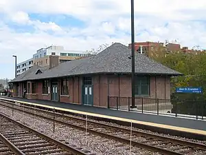 Evanston Main Street is the southernmost of the three commuter railroad stations in Evanston, Illinois. It is served by Metra's Union Pacific North Line trains, which go south to Ogilvie Transportation Center in Chicago and as far north as Kenosha, Wisconsin. Travel time to Ogilvie is typically 23 minutes, but can be as high as 26 minutes during rush hour. In Metra's zone-based fare system, the station is in zone C. As of 2018, Evanston Main Street is the 41st busiest of Metra's 236 non-downtown stations, with an average of 1,130 weekday boardings.[1] The station does not contain a ticket agent booth; passengers must purchase their tickets on board the train.