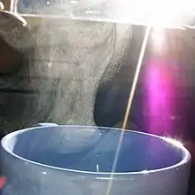 Evaporation is a type of vaporization that occurs on the surface of a liquid as it changes into the gas phase.[1] High concentration of the evaporating substance in the surrounding gas significantly slows down evaporation, such as when humidity affects rate of evaporation of water.[2] When the molecules of the liquid collide, they transfer energy to each other based on how they collide. When a molecule near the surface absorbs enough energy to overcome the vapor pressure, it will escape and enter the surrounding air as a gas.[3] When evaporation occurs, the energy removed from the vaporized liquid will reduce the temperature of the liquid, resulting in evaporative cooling.[4]