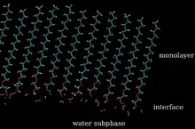 The specific mechanism that underlies monolayer evaporation resistance has been attributed to the physical barrier formed by the presence of these materials on the surface of the water (see figure).[1] The extent to which a material can resist the evaporation of water is best treated on a case-by-case basis, however, a number of empirically derived formulas have been reported. Before the advent of surface spectroscopic techniques such as Brewster Angle Microscopy (BAM) and Glancing Incidence X-Ray reflectrometry (GIXD), it was thought that the intermolecular spacing between monolayer molecules was the largest determinant factor governing evaporation suppression. When the surface density of the monolayer was sufficiently small, water molecules were presumed to pass through the space between molecules.[2][3][4][5] Scattering and imaging results, however, revealed that the intermolecular distance between monolayer molecules was essentially constant, and that evaporation was more likely at domain boundaries.[6] The factors governing the efficacy of an evaporation suppressing monolayer are the ability to remain tightly packed despite changes in surface pressure, the ability to adhere to the surface of water, and to neighbouring molecules.[7]