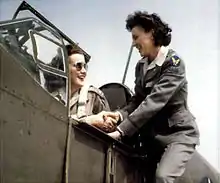 ![]() Evelyn Sharp sitting on a Vultee basic trainer plane on 7 March 1943 | |