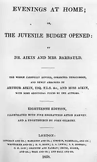 Evenings at Home, or The Juvenile Budget Opened (1792–1796) is a collection of six volumes of stories written by John Aikin and his sister Anna Laetitia Barbauld. It is an early example of children's literature. The late Victorian children's writer Mary Louisa Molesworth named it as one of the handful of books that was owned by every family in her childhood and read enthusiastically.[1] In their introduction, the authors explain the title in these words: