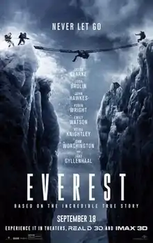 Prior to its wide theatrical opening in the United States and Canada on 25 September, the film received a limited release in IMAX 3D and other premium large format screens across 545 theaters on 18 September in order to build good word of mouth.[32] It made $325,000 from 481 IMAX screens and premium large-format screens from late night showings, which began at 7 pm,[40][41] and an estimated $2.3 million on its opening day.[42] It finished off the weekend at number five with $7.6 million from 368 IMAX and 177 premium large-format theaters.[43][44] IMAX comprised 78% ($5.8 million) of the opening weekend gross while premium large formats contributed 22% ($1.7 million).[44] This broke the record for the biggest IMAX September debut (breaking The Equalizer's $3.1 million record in 2014).[45] Everest is the first major film since Mission: Impossible – Ghost Protocol (2011) to receive IMAX only release for more than two days (The Walk became the next when it replaced Everest on 30 September 2015).[44]
