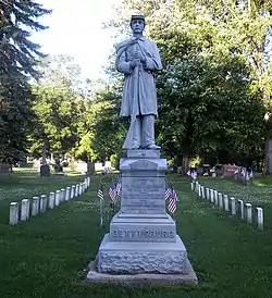 Evergreen Cemetery contains the graves of many United States war veterans. The cemetery is divided into sections for single graves, including those for the Spanish–American War and World War I. One of the more notable plots is the Tainter family plot, which is accompanied by a historic marker. The lot includes Dr. Stephen Tainter, a physician and Revolutionary War hero who enlisted at age 16 in 1776.[6] Tainter's body was relocated by his grandson Captain Andrew Tainter, a "lumber baron" and partner at Knapp Stout and Company, the organization that founded the cemetery.