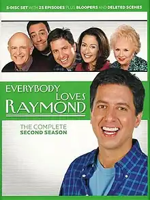 In the premiere season, Everybody Loves Raymond was critically acclaimed[1] and considered to be a quality series by CBS executives.[2] While most of its episodes suffered from low ratings due to being scheduled Friday night,[3] the average ratings doubled when it was moved to Monday in March 1997.[4] CBS renewed Raymond for a second season a month later on April 11, 1997.[5] The second season of Everybody Loves Raymond was produced by HBO Independent Productions, creator Philip Rosenthal's company Where's Lunch, and David Letterman's Worldwide Pants. While the season continues the episodic format and comedy style established in the first season, there are a few minor differences. These includes its increased presence of supporting actors such as Kevin James, Andy Kindler, and Monica Horan;[6] and the filming location switching from Hollywood Center Studios to Warner Bros. Studios, also the location of all later seasons. The intro for the second season depicts Romano sitting on a lawn chair while family members fly around him, except Robert.[7]