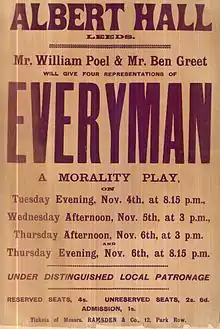 Everyman attracted the notice of British actor Ben Greet, who took over most of the production and direction responsibilities, and scheduled performances throughout England, Scotland and Ireland. Greet's productions differed from past performances in that he cast women in the title role, rather than the traditional male lead. The play was so successful that plans were soon made for a North American tour to be produced by American theater manager Charles Frohman, and directed by Greet.[3] Everyman opened on Broadway with Edith Wynne Matthison in the title role on 12 October 1902 in Mendelssohn Hall, continuing on 3 November 1902 at Hoyt's Theatre, then on 17 November 1902 at the New York Theatre, and finally on 30 March 1903 at the Garden Theatre. Everyman closed its Broadway run in May 1903 after 75 performances.[4]