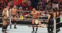 Seven years later, in April 2014, Triple H, Batista, and Randy Orton, now heels again, reformed their alliance after Daniel Bryan defeated all three of them in the same night to win the WWE World Heavyweight Championship in the main event of WrestleMania XXX.[54][55] The night after WrestleMania on Raw, Batista and Orton teamed together to face The Usos for the WWE Tag Team Championship, but the match ended in a no contest due to both teams being counted out.[56] Later that night, Batista and Orton, along with Kane, attacked Bryan before he was set to defend his title against Triple H. Before Triple H could defeat Bryan, The Shield interrupted by spearing him and taking out Orton, Batista, and Kane, causing Bryan to retain his title via no contest.[57]