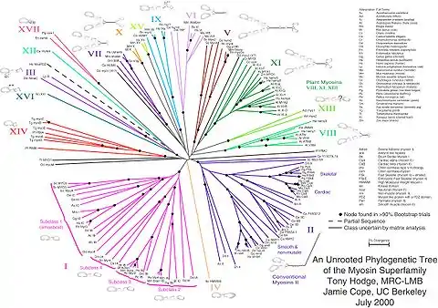- Hodge T, Cope M (1 October 2000). "A myosin family tree". J Cell Sci. 113 (19): 3353–4. doi:10.1242/jcs.113.19.3353. PMID 10984423. Archived from the original on 30 September 2007.