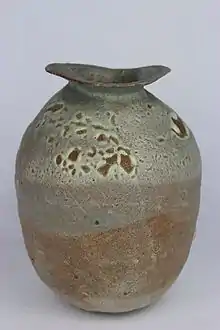 He preferred irregular, hand-built forms, and developed a technique in which a patchwork of different types of clay was used."[1]