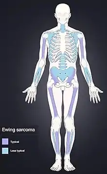 Ewing sarcoma is a type of cancer that forms in bone or soft tissue.[1] Symptoms may include swelling and pain at the site of the tumor, fever, and a bone fracture.[2] The most common areas where it begins are the legs, pelvis, and chest wall.[4] In about 25% of cases, the cancer has already spread to other parts of the body at the time of diagnosis.[4] Complications may include a pleural effusion or paraplegia.[3]