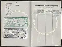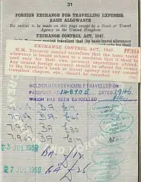 These powers were formalised after the war in 1947, in the Exchange Control Act.[3] As long as exchange controls remained in place, the amount of money British citizens could take out of the UK was severely limited. British passports contained a final page titled "Exchange Control Act 1947” in which foreign currency exchanges had to be listed,[4] the amounts permitted being capped at low levels.[1] In addition, British citizens were no longer free to invest in overseas assets such as foreign shares or property.[1]