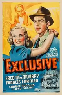 Exclusive is a 1937 American drama film directed by Alexander Hall and written by Jack Moffitt, Sidney Salkow and Rian James. The film stars Fred MacMurray, Frances Farmer, Charlie Ruggles, Lloyd Nolan, Fay Holden and Ralph Morgan. The film was released on August 6, 1937, by Paramount Pictures.[1][2]