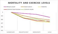 - Kyu, Hmwe H.; Bachman, Victoria F.; Alexander, Lily T.; Mumford, John Everett; Afshin, Ashkan; Estep, Kara; Veerman, J. Lennert; Delwiche, Kristen; Iannarone, Marissa L.; Moyer, Madeline L.; Cercy, Kelly; Vos, Theo; Murray, Christopher J. L.; Forouzanfar, Mohammad H. (9 August 2016). "Physical activity and risk of breast cancer, colon cancer, diabetes, ischemic heart disease, and ischemic stroke events: systematic review and dose-response meta-analysis for the Global Burden of Disease Study 2013". BMJ. 354: i3857. doi:10.1136/bmj.i3857. ISSN 1756-1833. PMC 4979358. PMID 27510511.
