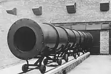This original detuner was a straight-through silencer, a simple acoustic tube. A later version consisted of four acoustic sections with a plain entry section inside the test cell, flanged and bolted together, mounted on wheels, and installed on rails to permit fore and aft movement. Each acoustic section consisted of an inner and outer casing: the outer casing was plain mild steel plate and the inner casing was perforated mild steel plate. The cavity between inner lining and outer casing was tightly packed with an acoustic absorbent material known as rock (mineral) wool.
