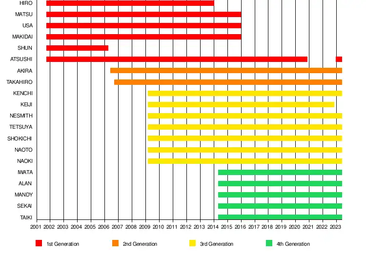 Since the formation of EXILE there have been many new generations of members as well as departures. As of 2021, AKIRA (Performer) is the longest serving active member of EXILE. Although HIRO is no longer an active member, he still remains EXILE's leader and occasionally appears in EXILE's Music Video's and Events. There are currently 13 active members in the group.