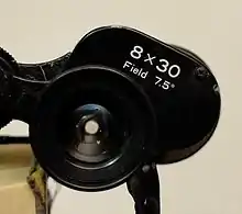Since the eye's pupil varies in diameter with viewing conditions, the ideal exit pupil diameter depends on the application.[1] An astronomical telescope requires a large pupil because it is designed to be used for looking at dim objects at night, while a microscope will require a much smaller pupil since the object will be brightly illuminated. A set of 7×50 binoculars has an exit pupil just over 7.14 mm, which corresponds to the average pupil size of a youthful dark-adapted human eye in circumstances with no extraneous light. The emergent light at the eyepiece then fills the eye's pupil, meaning no loss of brightness at night due to using such binoculars (assuming perfect transmission). In daylight, when the eye's pupil is only 4 mm in diameter, over half the light will be blocked by the iris and will not reach the retina. However, the loss of light in the daytime is generally not a concern since there is so much light to start with. By contrast, 8×30 binoculars, often sold with emphasis on their compactness, have an exit pupil of only 3.75 mm. That is sufficient to fill a typical daytime eye pupil, making these binoculars better suited to daytime than night-time use. The maximum pupil size of a human eye is typically 5–9 mm for individuals below 25 years old, and decreases slowly with age as shown as an approximate guide in the table below.[2][3][4][5]