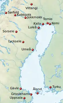Linnaeus then continued his travel along the coast to Tornio (Torneå in Swedish), from which he made his third and final inland incursion, along the Torne River as far as Vittangi. He spent some time in the Tornio area; in Kalix he received instructions in assaying. In the middle of September he began his return journey. Travelling via Kemi, he followed the Finnish coastline to Turku (Åbo in Swedish), where he sailed via Åland, arriving in Sweden in Grisslehamn and then finally home to Uppsala.[12]