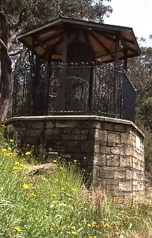 The tree died in the 1950s, but the stump of the tree, about 3 metres high and smeared with concrete, remains, located adjacent to the Great Western Highway. The stump was then protected from the weather and vandalism by a roof and a fence.[1]