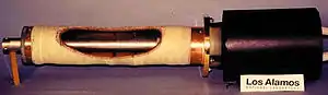- Conductive metallic discs, assembled in facing pairs to create hollow modules having the form of a lined torus, with explosive packed between pairs of modules, are stacked inside a cylinder;[7] the number of modules can vary according to the desired power (the figure shows a device of 15 modules), as well as the radius of the discs (of the order of 20 to 40 cm).