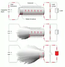 - A longitudinal magnetic field is produced inside a hollow metallic conductor, by discharging a bank of capacitors into the solenoid that surrounds the cylinder. To ensure a rapid penetration of the field in the cylinder, there is a slit in the cylinder, which closes rapidly as the cylinder deforms;