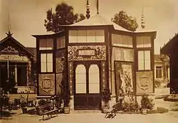 The exhibition was held in an area of 9,000 metres (30,000 ft) in the Parque del Buen Retiro. The project was led by the mining engineer Enrique Nouvion. The exhibition was clustered in one area, enclosed with a wooden fence, surrounded by trees and vegetation, and stood in the center of the main pavilion. The main pavilion was separated by an avenue lined with large ceramic frogs, leading to a lake fed by a river. The lake emptied into a rockery with a cascade, and on it was built the Royal Pavilion. A second smaller lake led through another large lake, closing the circuit. The weather conditions were a major inconvenience, and the different pavilions were built under snow, rain and wind, to the point that the exhibition was closed during the summer months to finish the work and reopened on 8 September. Most of the facilities built for the event were demolished at the end of the show, except the Royal Pavilion, which was demolished in the twentieth century, and the Palacio de Velázquez, which is the only building that remains today. The Development Minister commissioned architect Ricardo Velázquez Bosco to build the main pavilion, later known as the Palacio de Velázquez;[5] his team included engineer Alberto Palacio and ceramist tile maker Daniel Zuloaga, who through the Real Fábrica de La Moncloa, handled the palace's decoration.[6][7]