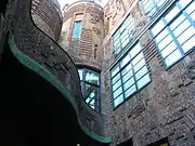 Influence of individualists such as Frank Lloyd Wright and Antoni Gaudí also provided the surrounding context for Expressionist architecture. Portfolios of Wright were included in the lectures of Erich Mendelsohn and were well known to those in his circle.[19] Gaudí was also both influenced and influencing what was happening in Berlin. In Barcelona, there was no abrupt break between the architecture of Art Nouveau and that of the early 20th century, where Jugendstil was opposed after 1900, and his work contains more of Art Nouveau than that of, say, Bruno Taut. The group Der Ring did know about Gaudí, as he was published in Germany, and Finsterlin was in correspondence.[20] Charles Rennie Mackintosh should also be mentioned in the larger context surrounding Expressionist architecture. Hard to classify as strictly Arts and Crafts or Art Nouveau, buildings such as the Hill House and his Ingram chairs have an expressionist tinge. His work was known on the continent, as it was exhibited at the Vienna Secession exhibition in 1900.