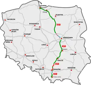 Expressway S7 or express road S7 (Polish: Droga ekspresowa S7) is a major road in Poland which has been planned to run from Gdańsk on the Baltic coast through Elbląg, Warsaw, Radom, Kielce and Kraków to Rabka near the border with Slovakia. It was built partially by upgrading National Road 7 (DK 7) and partially on a new alignment. The construction is co-financed by the European Union funding.[1] The total planned length of S7 is 720 km (450 mi), of which 572 km (355 mi) has been built and a further 78 km (48 mi) is under construction as of April 2023.