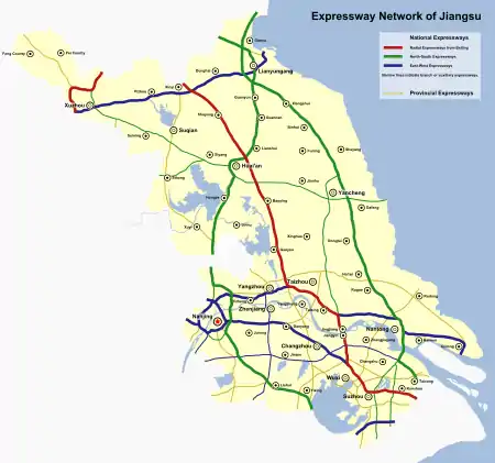 | Jinghu | Xinyi (Shandong border) | Huaqiao, Kunshan (Shanghai border) | 481 km (299 mi) | Fully complete | |