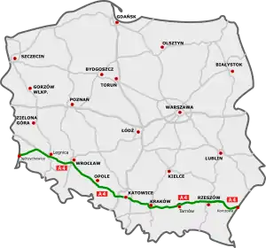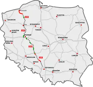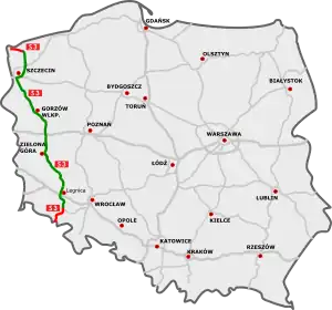 | Main section: Szczecin (A6) - Gorzów Wlkp. - Jordanowo (A2) - Zielona Góra - Lubin - Legnica (A4) |