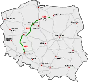 | Main section: Grudziądz (A1) - Bydgoszcz (S10) - Poznań (A2/S11) - Wrocław (A8) |