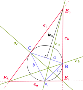 Here denotes the area of the triangle and the perpendicular line segments connecting the triangle sides with the exsymmedian points .