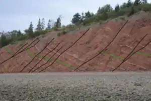 Array of extensional faults cutting Triassic to Lower Jurassic Blomidon Formation rocks, near Clarke Head, Minas Basin North Shore, Nova Scotia, position of faults highlighted in black, marker bed highlighted in green