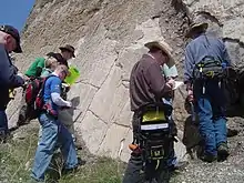 An extensional fault is a fault caused by stretching of the Earth's crust.[1] Stretching reduces the thickness and horizontally extends portions of the crust and/or lithosphere.[2] In most cases such a fault is also a normal fault, but may create a shallower dip usually associated with a thrust fault. Extensional faults are generally planar. If the stress field is oriented with the maximum stress perpendicular to the Earth's surface, extensional faults will create an initial dip of the associated beds of about 60° from the horizontal. The faults will typically extend down to the base of the seismogenic layer. As crustal stretching continues, the faults will rotate, resulting in steeply-dipping fault blocks between them.