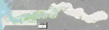 The Gambia is a very small and narrow African country with the border based on the Gambia River. The country is less than 48 kilometres (30 mi) wide at its greatest width. The country's present boundaries were defined in 1889 after an agreement between the United Kingdom and France. It is often claimed by Gambians that the distance of the borders from the Gambia River corresponds to the area that British naval cannon of the time could reach from the river's channel. However, there is no historical evidence to support the story, and the border was actually delineated using careful surveying methods by the Franco-British boundary commission.[1][2] The Gambia is almost an enclave of Senegal and is the smallest country on mainland Africa.